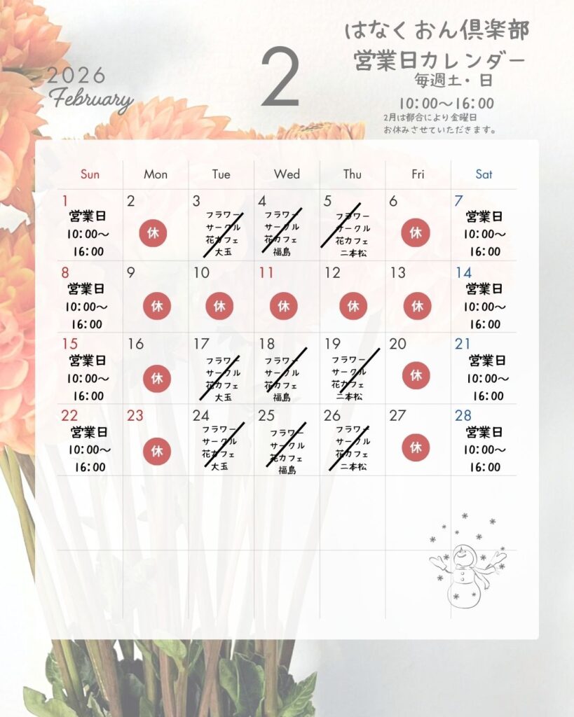 2月は都合により、毎週金曜日はお休みさせていただきまして、土日のみの営業になりますので、何卒ご理解をよろしくお願い申し上げます。また、ご予約いただければ、営業日以外でも対応させていただきます。